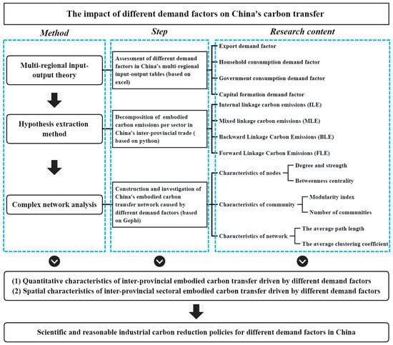 Investigating the mechanisms by which various demand factors influence the inter-provincial transfer of ECEs in China is crucial for identifying key nodal sectors and formulating targeted industrial policies. This study aimed to establish an I–O analysis framework combining HEM and CNA to evaluate the characteristics of China’s inter-provincial transfer of ECEs induced by different demand factors. To achieve this, demand factors such as exports, household consumption, government consumption, and capital formation were selected, and their impacts on the inter-provincial transfers of ECEs were evaluated separately. In detail, (i) HEM was adopted to quantify the influence of various demand factors on the ECEs and their transfers in inter-provincial trading. (ii) CNA was employed to reveal the composition of sectoral clusters and locate the key sectors from the perspective of different demand factors to further explore the discrepancies in the spatial characteristics of carbon transfer networks caused by different demand factors. In general, the proposed framework has the potential to be applicable to other countries and pollutants to provide a scientific reference with which policymakers to develop rational and targeted carbon mitigation policies from multiple demand perspectives. The main conclusions are summarized as follows: