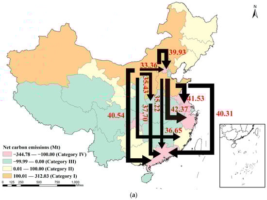 Figure 2a,b reveals the macroscopic characteristics of carbon transfer in China, for which several findings were observed. Firstly, the macro direction of the carbon emission transfer was from the resource-rich north to the trade-developed south of China. The resource-rich northern provinces were Category III and IV areas with net carbon outflows (e.g., Inner Mongolia and Shanxi), while the trade-developed central and southern provinces were Category I and II areas with net carbon inflows (e.g., Guangdong and Zhejiang). Secondly, the largest trade-embodied inter-provincial carbon transfer pathway was from Hebei to Zhejiang (42.37 Mt), followed by Shandong to Jiangsu (41.53 Mt), Inner Mongolia to Guangdong (40.54 Mt), Shandong to Guangdong (40.30 Mt), and Hebei to Beijing (39.03 Mt). Thirdly, from a sectoral perspective, carbon-intensive sectors such as Sectors 16, 10, and 9 were the main contributors to trade ECEs. As shown in Figure 2b, Sector 16 was responsible for the most carbon emissions with 2050.14 Mt, accounting for 55.63% of the total ECEs, followed by Sector 10 with 639.17 Mt (17.34%) and Sector 9 with 269.87 Mt (7.32%).