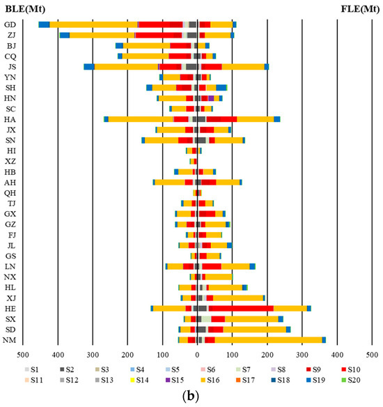 - The Category II and III provinces were mainly engaged in primary and secondary industries (the manufacturing of intermediate products), which require a large amount of both imports and exports. Henan was representative of such provinces and is the only Category III province in Figure 2a that is both the destination and source of top-ten carbon pathways. In detail, Henan absorbed 35.43 Mt of carbon emissions from Inner Mongolia and transferred 37.70 Mt to Guangdong, while its own NET was only 32.24 Mt. Figure 2b provides further details on the sectoral carbon emissions in Henan. It imported 184.45 Mt and 36.69 Mt from the Sector 16s and Sector 10s of other provinces, while it exported 105.18 Mt, 45.52 Mt, 41.24 Mt, 20.14 Mt, and 15.8 Mt from Sectors 16, 10, 9, 2, and 19, respectively. With industrial upgrading, Category I provinces have gradually abandoned some heavily polluting industries. However, these industries have been transferred to the central and northern provinces due to the continued demand for products from Sectors 14 and 17. The developed industries of these provinces provide the necessary intermediate products for the southern provinces. But they also import large quantities of energy and materials from the interior for further processing, which significantly increases their ECEs. Overall, the pressure on these production-based provinces to achieve their policy targets for carbon reduction is serious. To efficiently achieve carbon reduction targets, policymakers should consider the impact of industrial production and consumption on ECEs in different locations when allocating carbon mitigation responsibilities. In addition, not only should Category I provinces reduce the utilization of carbon-intensive products but Category II and III provinces, such as Henan, should also be subsidized for the application of low-carbon technologies and minimization of carbon emissions;