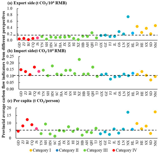Second, as shown in Figure 3b, the provincial average ECEs were more equal in terms of imports than in terms of exports. The distribution of scattered points was the opposite, with a gradual decrease from Category I to Category IV. Figure 3a,b reveals that the Category I provinces import substantial quantities of low-value-added energy and minerals from Category IV provinces, which are then re-processed into products such as mechanical and electronic equipment for export to other provinces. However, the proportion of carbon-intensive products imported by Category I provinces was higher, which led to a larger average embodied carbon emission from their imports. The distribution of the scattered points was slightly skewed downward to the lower right. In summary, it is crucial to emphasize the coordinated regional management of carbon emissions to avoid the carbon spillover effects caused by the industrial transformation in developed provinces. For instance, developed provinces should take some responsibility for the additional carbon emissions from the provision of mineral products in other regions. Controlling the carbon intensity of inter-provincial carbon transfers should be a common concern for both the supply side (e.g., Inner Mongolia and Hebei) and the consumption side (e.g., Beijing and Guangdong).