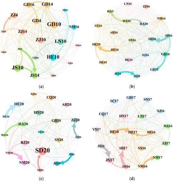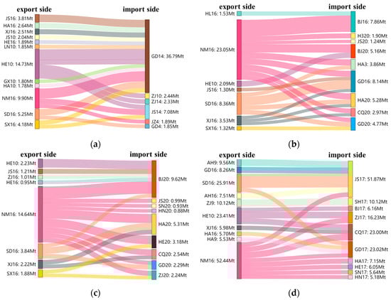 - The carbon transfer caused by export factors was the most concentrated, and the main contributor was the manufacture of electrical machinery and electronic equipment in the southern provinces. For instance, Guangdong, the main recipient of carbon transfers due to export demand (197.92 Mt), received 77.95 Mt in GD14 (mainly from Inner Mongolia, Hebei, and Shanxi in the north), which accounted for 39.39% of the province. From a sector-specific perspective, the top-ranked export-related carbon transfer was HE10–GD14 (5.34 Mt), followed by NM16–GD14 (5.11 Mt). Seven of the top ten carbon transfers were from northern provinces (i.e., Hebei, Inner Mongolia, and Xinjiang) to southern provinces (i.e., Guangdong, Jiangsu, and Zhejiang), which coincides with Conclusion (1). In addition, the concentration of an export-related carbon transfer network was relatively high, with the highest number of inefficient paths (47,607), a higher average path length (1.058), and a lower number of modular communities (13). The key export-side sectors represented by GD14 should be restricted from importing carbon-intensive products and encouraged to develop clean technologies.