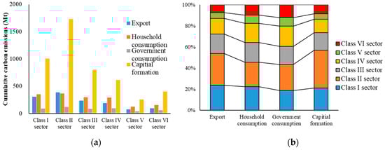 - The Category I provinces in China were mainly located in coastal areas or served as the hub of the country’s commodity trade, including Guangzhou, Zhejiang, and Beijing. Among these provinces, Guangdong was the most typical and important Category I province, receiving four of the top ten inter-provincial trade-embodied carbon transfer pathways and contributing about 33.73% (153.78 Mt) of the province’s total carbon imports. Figure 2b shows that Sector 16 was the main contributor to Guangdong’s imported carbon emissions (251.46 Mt), followed by Sector 10 (87.59 Mt) and Sector 9 (37.65 Mt). The rapid development of Guangdong’s automobile, electronics, and petrochemical industries has severely tested the resource-carrying capacity of its ecological environment. The huge demand and limited resources have led Guangdong’s enterprises to outsource carbon-intensive production and services to other regions, which is common among Category I provinces. However, the regions accommodating industrial transfer would generate substantial carbon emissions and, thus, bear a disproportionate share of liability for emissions reduction, which is unfair to production-oriented regions. Moreover, Beijing, the capital and commercial center of China, was the only non-coastal Category I province that was the destination of two major inter-provincial transfer pathways, with its NET second only to those of Guangdong and Zhejiang (−200.62 Mt). The booming services and logistics industry in Beijing is driven by household consumption and business activity, but this has also led to its dependence on carbon-intensive products from inland provinces;