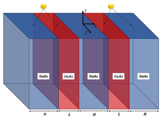 To describe the dynamics of photoelectrons in a solar cell with an intermediate band, a cell model is used that incorporates two InAs semiconductor plates with width L, symmetrically embedded in a GaAs matrix along the direction, as illustrated in Figure 1. The intermediate band is formed by additional states trapped in the quantum wells potentials generated by the presence of InAs. This type of cell is known as a quantum well intermediate band solar cell (QW-IBSC).