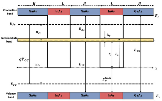 where and are the extremes of a absorption band, u is the chemical potential, c is the speed of light, and is the Boltzmann constant. Note that to determine the efficiency of this QW-IBSC, it is necessary to calculate each of the parameters in Equation (8). Next, we present a systematic methodology that allows us to determine each required parameter. From Figure 2, it is easy to identify the relations between the chemical potentials and the output voltage :
