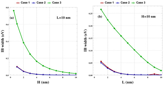 Figure 3 illustrates the IB profile as a function of the size of the InAs quantum well (panel (a)) and width of the GaAs quantum barrier (panel (b)) for the three cases mentioned earlier. In general, the IB width in both panels tends to decrease in each case, with the system containing impurities in the center of the quantum wells (Case 3) displaying a notably wider IB (at small values of L and H) compared to Cases 1 and 2. However, as L and H increase, this difference diminishes, as shown in panels (a) and (b), respectively. Note that the values obtained for the IB (intermediate band) in the QW-IBSC with impurities positioned at the center of the quantum barriers (Case 2) are slightly lower than those found in the case without impurities (Case 1), considering any L and H (see Figure 3). We believe that this behavior is due to the repulsive nature of the barriers, which might promote an environment conducive to increased charge carrier recombination in the presence of impurities. This would counteract any significant impact of impurities on the width of the IB and, consequently, on its performance. This behavior has already been reported in experimental scenarios in solar cells [24,35]. Case 3, on the other hand, represents a potential scenario in which the efficiency surpasses that reported in traditional GaAs p-i-n cells.