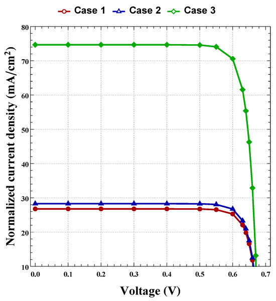 Figure 4 shows the J-V characteristic profile of the proposed QW-IBSC under fully concentrated light for Cases 1 (red line), 2 (blue line), and 3 (green line), where the short-circuit current density is normalized by the power factor (); meanwhile, the open circuit voltage () is approximately constant. Note that the position of impurities directly influences normalized current density. The QW-IBSC containing impurities in the center of the quantum wells (Case 3) denotes a higher value than in other cases. This behavior results from the enhanced photon absorption and electron excitation within the solar cell, leading to an increased photogenerated current. These results are consistent with those shown in Figure 3.