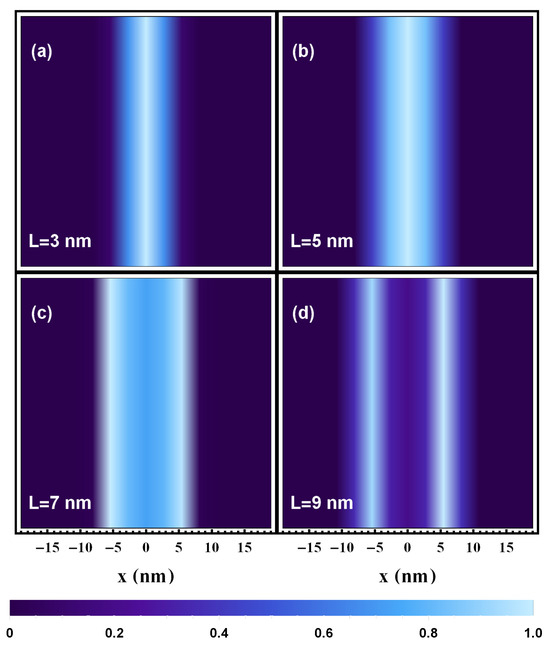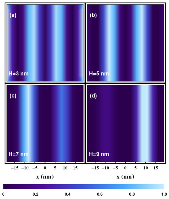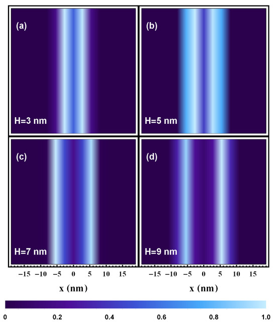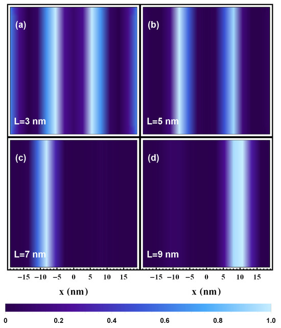 Figure 7 shows the behavior of the local density of the ground state in the context of Case 3, considering a constant value of nm and varying H at 3, 5, 7, and 9 nm. The local density exhibits two peaks of maximum intensity symmetrically located and opposite to the axis of the central barrier when impurities are situated in the center of the quantum wells. Note that the areas of maximum density tend to separate as H increases (panels (a)–(d)). However, owing to the confinement exerted by quantum wells, these additional states remain restricted between the impurity positions. Unlike in Figure 5 and Figure 6, in this configuration the local density displays symmetry in both cell halves, indicating uniform behavior. However, in Figure 8, considering nm, the formation of a single peak of maximum density in the regions near the midpoint of the central barrier is observed. Nevertheless, this peak splits into two uniform and symmetrical peaks as the size of the quantum well L increases (panels (a)–(d)). Therefore, based on these configurations, it could be argued that cells with impurities located in the center of the quantum wells would offer improved performance compared to Cases 1 and 2.