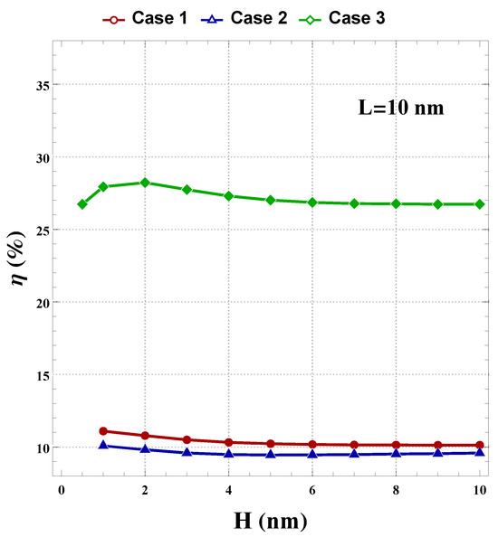 Photovoltaic conversion efficiency as a function of the H for Cases 1, 2, and 3.