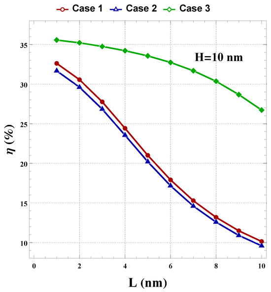 Photovoltaic conversion efficiency as a function of the L for Cases 1, 2, and 3.