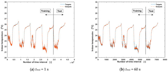 Figure 9 shows various error metrics such as R2, RMSE, and MAE in the model using ANN for subsampling time steps of 1 s, 60 s, 180 s, 300 s, 600 s, 900 s, 1800 s, and 3600 s. Considering the actual operation control mode in which the time interval is important, a comparative analysis was performed accordingly. In addition to the commonly used MSE, MAE, and coefficient of determination (R2), various error indicators in the literature were calculated and trends were compared for reference [10]. Here, looking at the RMSE results, it can be seen that it is desirable to keep the control time interval to 300 s or less because the RMSE value maintains 0.3 or less when the measurement interval of indoor temperature is 300 s or less. When the measurement time interval is longer than 900 s, the RMSE increases rapidly and then decreases at 3600 s. Other performance indicators except SSE, MBE, and NMBE show similar and fairly good trends in this study (See Table 2). A multistep time interval tmsi higher than 900 s is not recommended because the R2 value drops to less than 0.5. Note that it goes to negative unexpectedly at a tmsi of 3600 s. In addition, the computing time is too long at the measurement interval of 1 s, so it is not suitable to use them for control purposes.