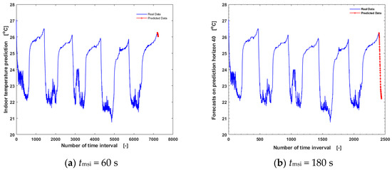 Figure 12 shows the future predictions or forecasts for typical cases where the delays or lags are 30 and 360, respectively, when the tmsi is 60 s. Two typical behaviors of the forecasted indoor temperature are depicted in Figure 12. The red lines in Figure 12a,b are represented by short-term predictions for delays of 30 and 360, respectively. Plausible behavior is exhibited by Figure 12a, while violent oscillations are demonstrated in Figure 12b. From this, it can be seen that the delays significantly impact the results. To examine the effect of these delays on the future predictions more precisely, we obtained the future predictions when the delays changed to 30, 60, 120, and 180 for the case where the multi-step interval tmsi is 60 s and the prediction horizon is 360. The results are compared and presented in Figure 13. To enhance the visibility of the figure, only 10% of the obtained results are marked with symbols. According to the results, when the delays exceed 180, the predicted indoor temperature exhibits large oscillations and becomes unstable. Furthermore, when the delays are below 120 and the prediction horizon number is less than 100, the forecasted indoor temperatures are nearly similar. Namely, if the control horizons are set below 100 for the neural network with an MLP configuration, we can obtain reliable and stable short-term predictions. In short, if the delays are small, the resulting Hankel matrix from time series data is tall and skinny, exhibiting stable characteristics (Figure 12a). However, as the delays increase, the Hankel matrix becomes shallow and wide [9]. This increases calculation time and accumulates errors as the prediction horizon increases, causing instability and large oscillations in temperature calculations (Figure 12b). In other words, when the delays are within a suitable range of input neurons, they exhibit good behavior. For example, prediction and control horizons ranging from 1 to 100 are adopted as tuning parameters when practically implementing model predictive control [24].