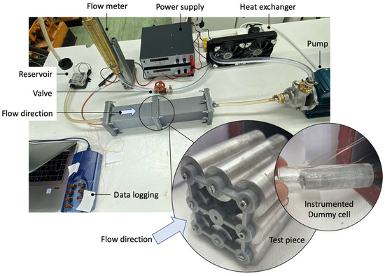The dummy cell was assembled in the middle of a set of non-energized battery geometries, thus recreating the flow channels between the cells, as shown in Figure 5. The battery stack was mounted inside a flow chamber through which the coolant would flow. In this investigation, a synthetic coolant, Opticool Fluid [36], was adopted. Such fluids are highly sensitive to temperature. The fluid properties vary with temperature, as shown in [35] and recreated in Table 1. These were used to calculate the properties of the flow and later compare the experimental results with empirical correlations. The coolant was circulated from a reservoir into the test box and then pumped through a heat exchanger to reject heat to ambient before being returned to the reservoir. The flow rate was regulated using a globe valve and measured using a variable area flow meter. The liquid circuit is shown in Figure 6.