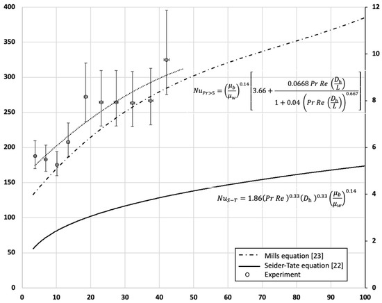 Conversely, the Seider–Tate equation, which is designed for fluids with 0.6 < Pr < 5, produced a significant underestimation of the HTC. The authors attribute this discrepancy to the Prandtl number of the fluid, shown in Figure 10. The large value makes the Seider–Tate equation inadequate. The result shown here, therefore, also highlights the importance of adequately assessing the properties of the fluid and the flow and ensures that any empirical correlations used fit within the regime for which they were designed.