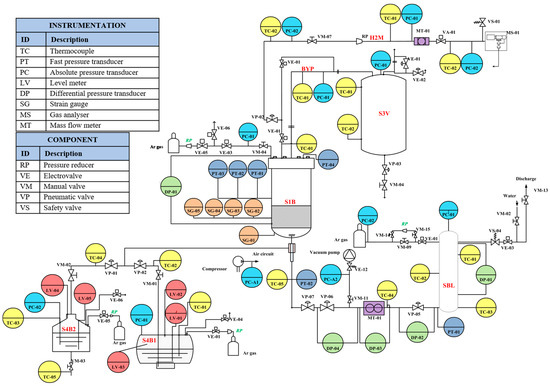 It appeared clearly the need of experimental data (1) with “more controlled” initial and boundary conditions, (2) with suitable and reliable instrumentation and (3) specifically designed for supporting the development and implementation of the chemical reaction model and for providing qualified data for code validation purposes. Therefore, in parallel, a new separate effect test facility was designed and built, LIFUS5/Mod3 [9]. The details of the facility are reported in Refs. [9,10] and a piping and instrumentation diagram is reported in Figure 2. The main components of the facility are:
