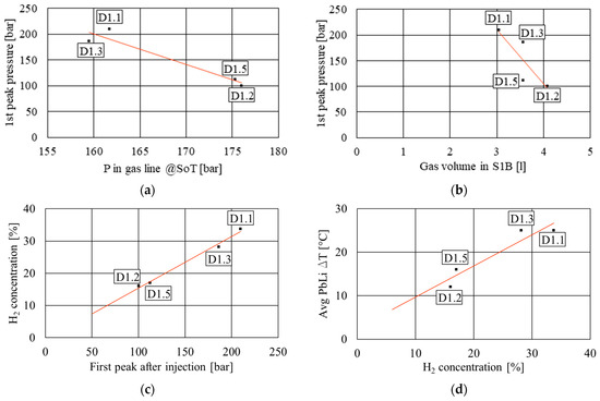 Figure 3. Correlations between relevant parameters of the interaction (series D). (a) pressure in injection line vs. first pressure peak. (b) free gas volume in reaction vessel vs. first pressure peak. (c) first pressure peak vs. H2 concentration (d) H2 concentration vs. PbLi temperature. - ○