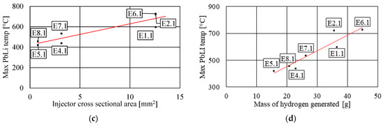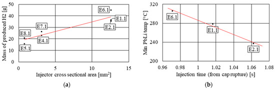 - A correlation between the mass of hydrogen produced by the reaction and the injector’s cross-sectional area. This correlation is shown in Figure 4a. Here, we can see how higher injector cross-sectional areas correspond to a higher production of hydrogen. This is partially related to the fact that higher cross-sectional areas are associated with a greater amount of water injected into the vessel, but the different spreading of the jet inside the alloy might also play a role in the amount of water that is able to react;