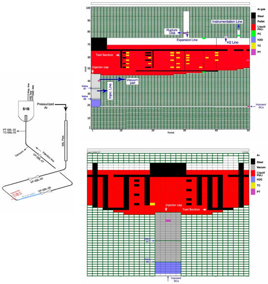 The SIMMER-III geometrical domain is obtained by 50 radial and 100 axial mesh cells and the SIMMER-IV geometrical domain is obtained by 31 × 31 planar and 52 axial mesh cells (Figure 6). Colors distinguish the different fluids and structure material, as set at the beginning of the transient (t = 0 s). Therefore, PbLi is represented in red, water in blue, and argon cover gas (and hydrogen produced by the reaction) in white; the non-calculation zones are highlighted by a green mesh fence and SS316 (in black) is used as the structural material. The reference mesh cells for temperature analysis inside the S1B, representing the position of installed TCs in S1B, are highlighted in yellow and the reference cells for pressure measurement are highlighted in purple.