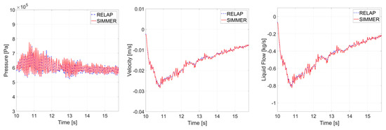 The reference calculation starts at t = 0 s, which represents the time at which the injection valve opens. The injector cap rupture is simulated by the disappearance of the virtual wall, which recreates an orifice. The time at which the injector breaks up is obtained from the specific tests’ experimental data. The injection pressure trend recorded in the injection line is imposed as a boundary condition as well as the condition of continuous inflow. The initial conditions of pressure, temperature, and the filling level of lithium–lead in S1B are set coherently with the experimental data.