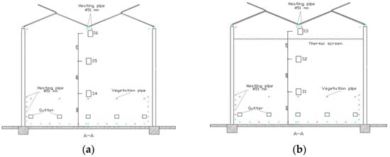 Two greenhouses were used in this study, one without a thermal curtain (Figure 1a) and one equipped with a thermal curtain (Figure 1b).