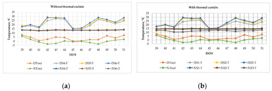 Figure 3. Average temperature values measured indoors in the greenhouse (a) without thermal curtain and (b) with thermal curtain.