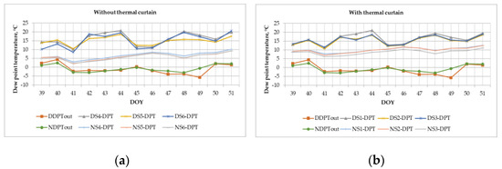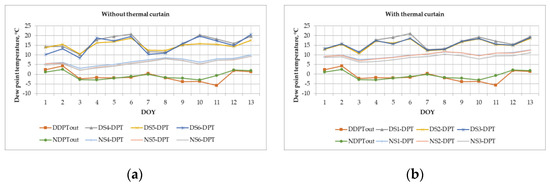 Figure 5. The dew point temperature values measured in the greenhouse (a) with a thermal curtain and (b) without a thermal curtain.