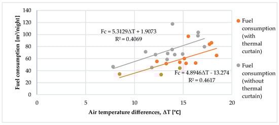 In the present study, when the indoor temperatures were kept at 15 °C in both greenhouses, fuel consumption, heat energy consumption, the overall heat transfer coefficient, the equivalent of the amount of CO2 released into the atmosphere and fuel cost were determined. Fuel consumption was considered a function of the indoor and outdoor air temperature differences with and without thermal curtains. The temperature difference (∆T) reached, depending on the amount of fuel consumed in the greenhouses, is given in Figure 6 for the experimental greenhouses.