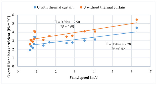 Figure 7. The relationship between overall heat transfer coefficient and wind speed of the greenhouses with and without thermal curtain.