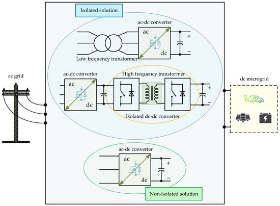 There are different methods to connect DC microgrids to AC grids. In general, the use of a transformer is suggested to increase reliability and isolate the two sides. In the initial structures, it was suggested to use a low-frequency transformer followed by an AC–DC interface converter [12]. Due to the high volume and weight of the low-frequency transformer, attention was directed to the use of a high-frequency isolation structure. With a high-frequency transformer, an AC–DC interface is used first, and then a high-frequency isolated DC–DC converter structure is applied [13,14,15]. In these cases, galvanic isolation is used to increase reliability and eliminate leakage currents. In isolated cases, the transformer increases the size and cost and reduces the overall efficiency. While many studies have considered it necessary to use isolation for connecting the LVDC microgrid to the AC grid, there is no obligation to use an isolation method, especially if it is defined as a hybrid DC/AC system [16].