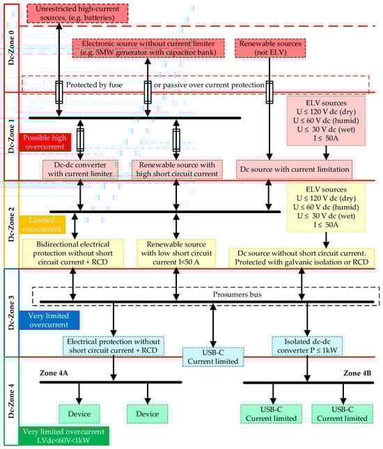 Production and consumption can exist in Zone 3. The voltage level of the line to the ground can be a maximum of 400 V line-to-ground and line-to-line 800 V. The overload current is limited, and the maximum current for each device is 50 A.
