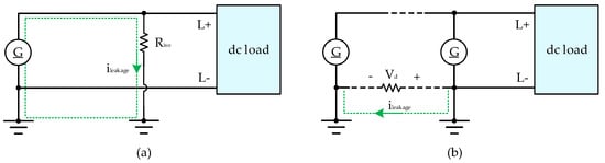 Besides the AC leakage current, the DC leakage current is the DC current passing through the insulation resistance of the conductor [24,44,45,46,47] or in situations where there is a potential difference between the grounds of the DC system. The DC leakage caused by the insulation resistance is usually insignificant compared to the AC leakage. The insulation resistance of the conductor decreases over time or due to humidity and dust, and this can increase the DC leakage current. As mentioned, to eliminate the AC leakage current, CMV should be fixed. In this case, the parasitic capacitor is open-circuited. But still, a constant voltage falls on the insulation resistance, and the DC leakage current passes through the insulation resistance and the grounds of the system. The value of the DC leakage current can easily be calculated by Ohm’s law, as in Equation (8). But the point is in the estimation method of insulation resistance. Some methods for testing and estimating insulation resistance have been reviewed in the literature [39,48].