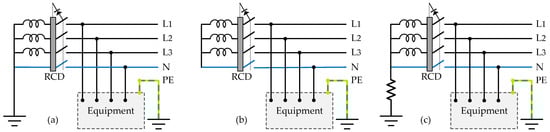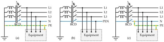 Configuration of TN grounding schemes in the AC system: (a) TN-S; (b) TN-C; (c) TN-S-C.