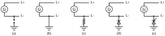 DC microgrid grounding devices: (a) ungrounded; (b) solidly grounded; (c) resistance grounded; (d) diode grounded; (e) thyristor grounded [26].