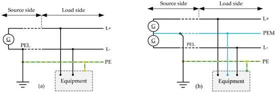 TN-C grounding in the DC system with (a) two conductors (unipolar) and (b) three conductors (bipolar).
