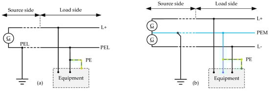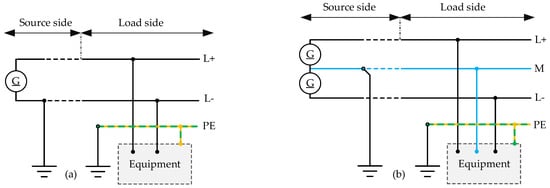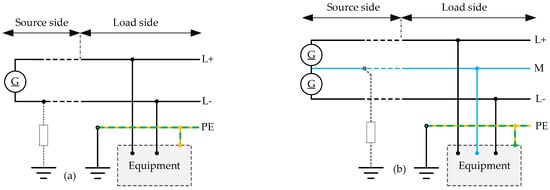 TN-S grounding in the DC system with (a) two conductors (unipolar) and (b) three conductors (bipolar).