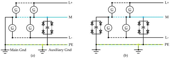 Using Equations (1) and (2), the paths of high-frequency elements can be extracted. It can be deduced that differential voltage can also include high-frequency elements, which is effective in creating leakage current. These additional high-frequency elements from Vdm can be written as Vcm−dm in Equation (3).