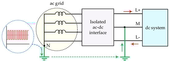 The best solution for the non-isolated connection of DC microgrids to the AC grids can be the use of common-ground structures [43,72,73,74,75,76,77,78,79]. In this case, considering that the negative pole of the DC system and the neutral of the AC grid are directly connected to each other, a similar or even asymmetrical grounding method can be used for both sides. In the common-ground structure, the common-mode voltage on the DC negative and the AC neutral is clamped to zero, and their stray capacitors are bypassed. Therefore, the AC leakage current can be eliminated. The DC leakage current can also pass through insulation resistance ground on the DC side system. To solve this, a TN-S-CD type of connection (Figure 15) should be used on the DC side. Figure 19 shows the general view of this solution.