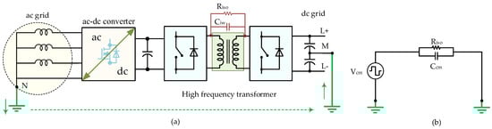 (a) Leakage current path through a parasitic capacitor on the DC side and grounded AC side. (b) Equivalent circuit of the leakage current.