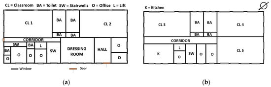 The air change rate in all the thermal zones is set to 0.5 h−1 and the set-point temperature for the heating system is set to 20 °C for offices, kitchen, classrooms, and bathrooms, while it is set to 16 °C for all the other heated zones (the only non-heated zones are the lift, the cellar, and the stairwells to the cellar). For cooling, a set-point of 26 °C has been prescribed, but corridors, entrances, bathrooms, and stairwells are considered not cooled (surface floor area of cooled thermal zones is 480 m2).