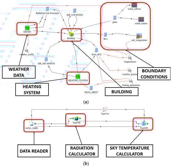 Figure 6b, a focus on the weather data processor is shown, as built in Trnsys. Indeed, Trnsys is a commercial dynamic simulation software based on ‘blocks’ (referred to as ‘types’) that encapsulate the behavior of a component or a physical phenomenon (such as a building, a boiler, or a water pump) through models generally based on differential equations. Within these types (which can be interconnected through links, as shown in