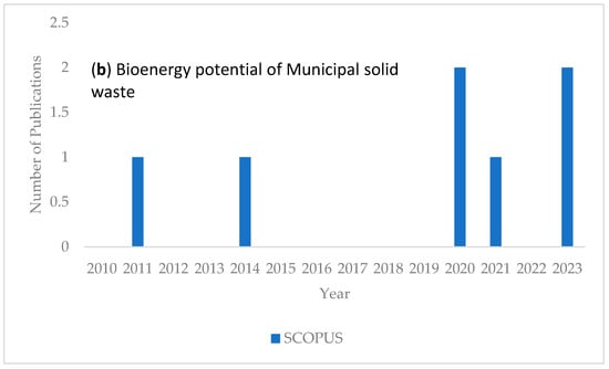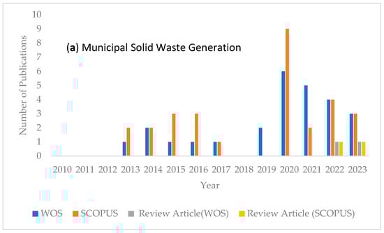 Publication trend of (a) municipal solid waste generation and (b) bioenergy potential of municipal solid waste from 2010 to 2023 (Web of Science database, 10 November 2023; Scopus database, 10 November 2023).