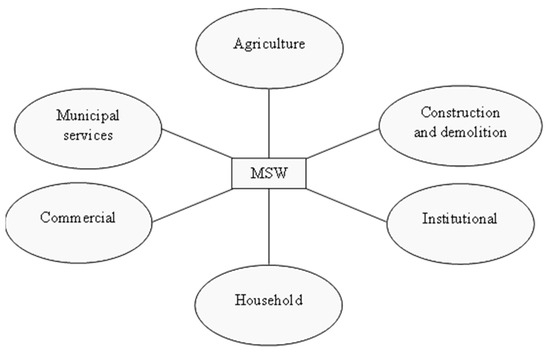 A variety of solid wastes are regularly disposed of by urban and rural residents as trash. Different municipalities and countries generate municipal solid waste with varying compositions. The differences in lifestyle, economic conditions, industrial structure, and waste management laws are the main causes of the compositional variations [7]. Approximately 2 billion tonnes of municipal solid waste are produced each year around the world [8]. Figure 2 shows the various sources of MSW.