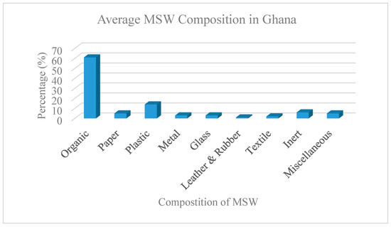 The organic fraction of MSW (OFMSW) is the world’s leading contributor to MSW, accounting for about half of all generated waste [17]. Using the waste composition of 61% organics, 14% plastics, 5% paper, 1% leather and rubber, and 1% textiles in 2015 [18] as a base (shown in Figure 4), MSW compositional generation from 2010 to 2030 was estimated for Ghana from the data obtained from Akrami (2021) [16], as shown in Figure 5. Ghana is known to be a country heavily engaged in agriculture. Most of the produce from agriculture is consumed by the population in Ghana. After consumption, the food waste produced is high, and this is the reason why organic waste has the highest MSW content in Ghana. Unutilized OFMSW produces unutilized methane gas, which contributes to global warming and causes rapid climate change. It is estimated that the organic fraction of MSW in Ghana will reach a generation of approximately 12,439 tons/day by 2030.