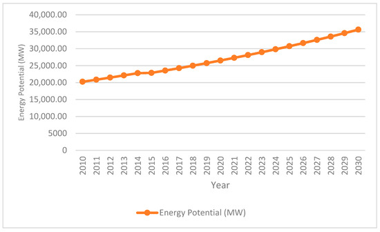 The results presented in Figure 6 show the potential energy that could be generated from MSW collected annually from 2010 to 2030, as estimated by Akrami (2021) [16]. From the results, it can be observed that the energy potential of MSW collected in Ghana in 2010 was 7389.42 GWh of electricity flow, which is equivalent to 843.54 MW installed capacity. From Figure 6, it can be deduced that Ghana’s MSW daily generation rate of approximately 19.2 million kg can produce about 35,622 MWh every day. This translates into an annual generation of 13,002.03 GWh and 1484.25 MW in installed electricity capacity, representing about 59% of Ghana’s total renewable energy target in 2030, as reported by the Energy Commission (2019) [95].