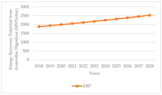 Figure 7 details the estimation of electrical energy potential for anaerobic digestion for the 2018–2028 period. Generation in Ghana will increase to 2527.977 MWh/day in the year 2028 as population and waste generation per capita increase per projection.