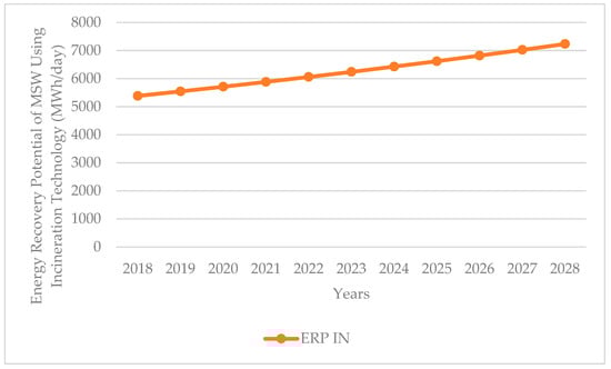 The organic fractions of municipal solid waste (OFMSW), plastics, paper, leather, rubber, and textiles are the preferred raw materials for incineration technologies, which are combustible. Equation (2) [96] was used to calculate the electricity generation potential that can be obtained from the incineration of municipal solid wastes from 2015 to 2028.