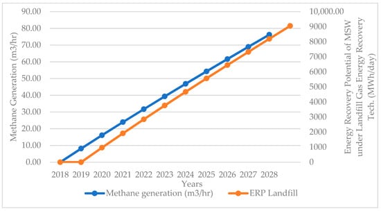 The amount of energy recovery potential that can be generated from landfill gas was calculated using Equation (4) [105]. The recovery rates of methane and electrical efficiency were estimated to be 75% and 33%, respectively [105].