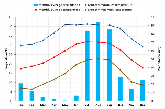Ciudad Obregon is in the extreme south of the state of Sonora, Mexico. The average altitude is 40.00 m above sea level. In this locality, there is a very severe climate [11] (see Figure 1), in which the monthly average temperatures during the summer are far from the thermal comfort temperature (from 17 to 27 °C), reaching, generally, 32 °C on average and 25 °C and 38 °C as minimum and maximum temperatures, respectively. On the other hand, during the winter, temperatures reach 17 °C on average. Also, temperatures reach a minimum of 10 °C and a maximum of 25 °C. This creates a problem of thermal comfort that the inhabitants usually solve in a conventional way (air-conditioners, evaporative coolers, fans, and heaters), using methods that result in high electricity consumption and indirectly contribute to the generation of pollutants.