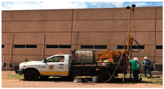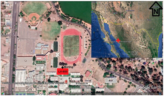 The overall objective of this study is to determine the quasi-seasonal variation in the thermal inertia of the subsoil at ITSON’s Nainari campus to identify an optimal depth for implementing a ground–air heat exchanger system. This system aims to cool the interior of the LV-800 building during hot weather. The specific objectives include defining the stratigraphic column of the subsoil, measuring temperature variations with depth during the warmest and coldest months, determining the depth at which the underground temperature maintains comfort level during summer, and designing a solution to reduce classroom temperatures in the selected building by at least 10 °C on the hottest day of the year. The study is temporarily divided into three phases, covering specific time periods in 2018 and 2019. The geographic scope is confined to the Nainari campus of the Sonora Technological Institute in Obregon City, Sonora, Mexico (Figure 2), with the survey conducted behind the LV-800 building. The geographical coordinates of the sounding point are 27°29′37.4″ N; 109°58′16.3″ W.