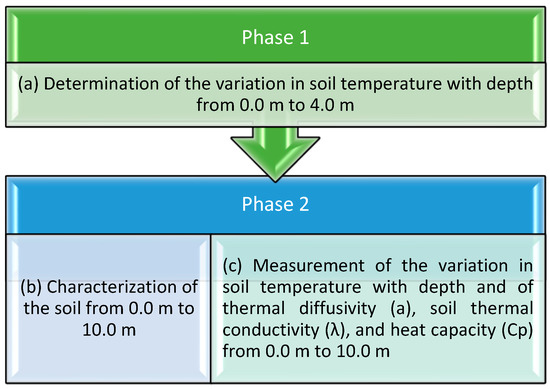 Initially, the aim was to obtain information on the variation in soil temperatures with the lowest possible economic investment, so a 4 m deep well was drilled with a hand auger (Phase 1). Some time later, with the results of the first phase study, it was necessary to extend the depth of the study to 10 m and its scope by determining more thermal properties of the soil. The analysis of the thermal behavior of the subsoil was conducted in three parts divided into two phases, which are shown in the following figure (Figure 3) and explained below.