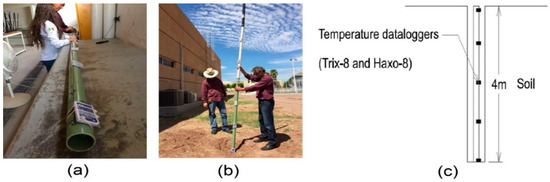 To determine the thermal inertia of the subsoil in Phase 1, a place located 3 m north of the LV-800 building of the Technological Institute of Sonora (ITSON), Nainari campus, was geographically delimited (see Figure 2). With the help of a manual auger to perform the drilling, LogTag brand Trix-8 and Haxo-8 temperature recorders were placed, which have an accuracy of ±0.5 °C for a range of measurement temperatures from −20 °C to +40 °C, at the following depths: 0.15 m, 0.5 m, 1.0 m, 1.5 m, 2.0 m, 2.5 m, 3.0 m, 3.5 m, and 4.0 m. The sensors were attached to a PVC tube, and this was introduced into the shaft, which was filled entirely (see Figure 4a–c). Through these sensors, the maximum and minimum temperatures were obtained from 25 August to 6 October 2018; later, the average temperatures were calculated. The subsoil temperatures are compared with the air temperature registered by the ITSON Climatological Station, located a few meters from the site. Information from the weather stations of the Red de Estaciones Meteorológicas Automáticas de Sonora (REMAS) was also used to complement the data from the ITSON Climatological Station. Also, the average statistical trend of the temperature was calculated by using a spreadsheet.